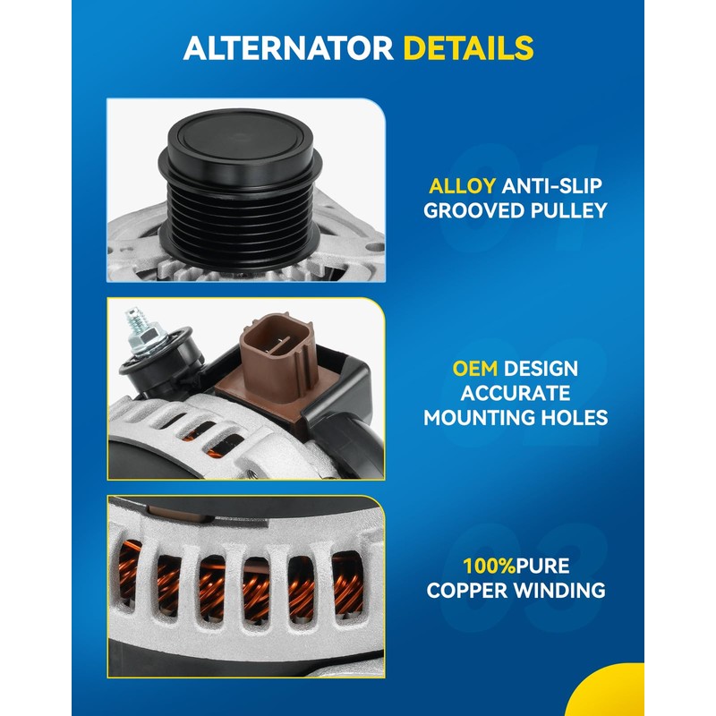 • 100% NEW ALTERNATOR: High output alternator provide electricity to the vehicle and recharge the battery. Made by precision CNC machining castings, Die-cast aluminum alternator, Pure copper winding, external insulating coating to prevent short circuit, stable and strong power for vehicle, If there is excess power, the power storage system will be fully utilized