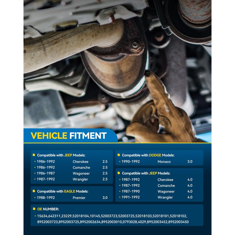- [COMPATIBILITY] --- Catalytic converters compatible with 1987-1992 Wrangler 2.5/4.0L, 1986-1992 Cherokee/ Comanche 2.5/4.0L 1986-1990 Wagoneer 2.5/4.0L. Reference Number: 15634, 642311, 10145.These free-flow catalytic converters have bolt-on connections and flange to flange design for effortless installation.