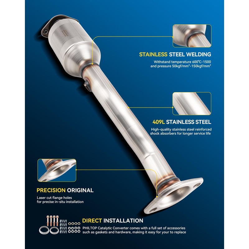 - [HIGH FLOW PERFORMANCE ] --- Our catalytic convertor are built to meet OEM specifications. They also feature a high flow design to increase conversion efficiency and vehicle power without sacrificing flow rate.They're also complete with full accessories as gaskets and hardware, facilitating your replacement.