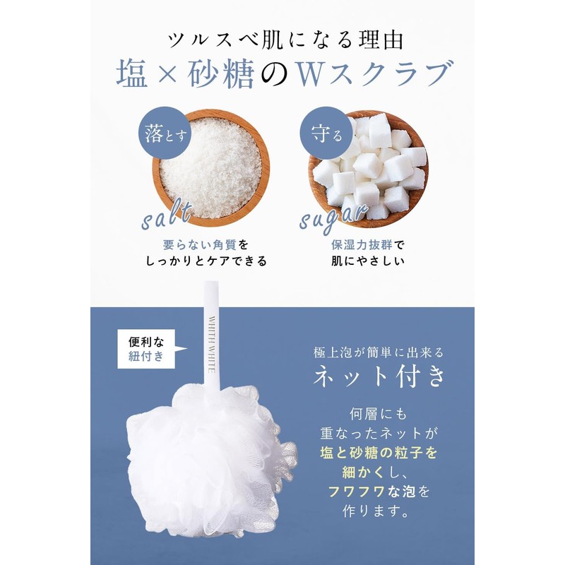 - (For melting skin): WHITH WHITE body scrubs are made with a focus on beautiful skin. Hypoallergenic scrubs with just the right amount of grains for corneum/blackhead care. Large capacity 17.6 oz (500 g) with dedicated net