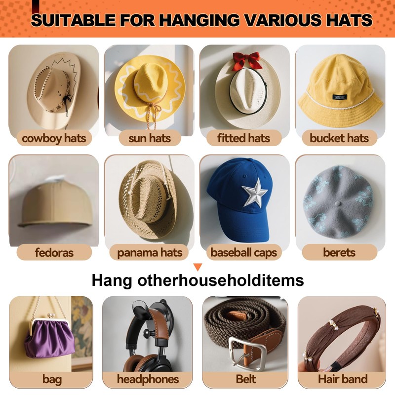 - 【Multifunctional】 This is an excellent storage and display solution for a variety of hat types, including cowboy hats, baseball caps, snapback hats, fitted hats, sun hats, and flat brim hats. Additionally, the hat hooks can also be used as headphone hooks and for other household items.