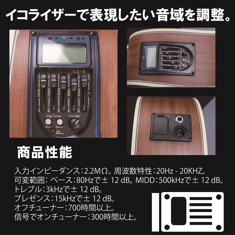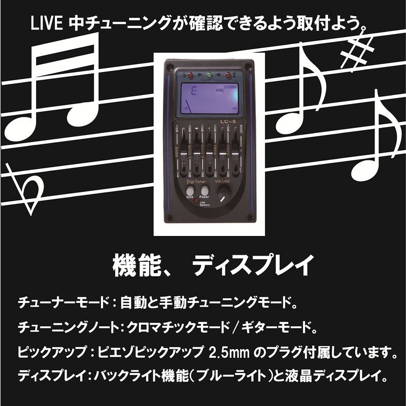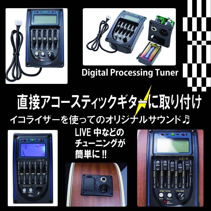- Features: Digital equalizer tuner for acoustic guitars. Attach to an acoustic guitar so you can easily see your live tuning! You can also check the volume, tone and tuning. Customize your own acoustic guitar! You can adjust the sound range you want to express with the equalizer to make your original sound