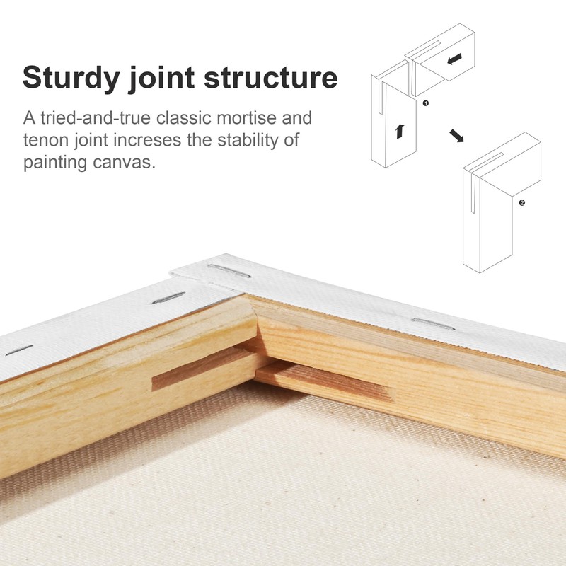 - PINEWOOD STRETCHER BARS – Standard size for easy framing and hanging on the wall. Wood structures with mortise and tenon connection ensures the frames firm and sturdy. Canvases are stretched tightly onto the bars and back stapled to create clean edges. Without deformation, they are tough enough for impasto and acrylic pouring.