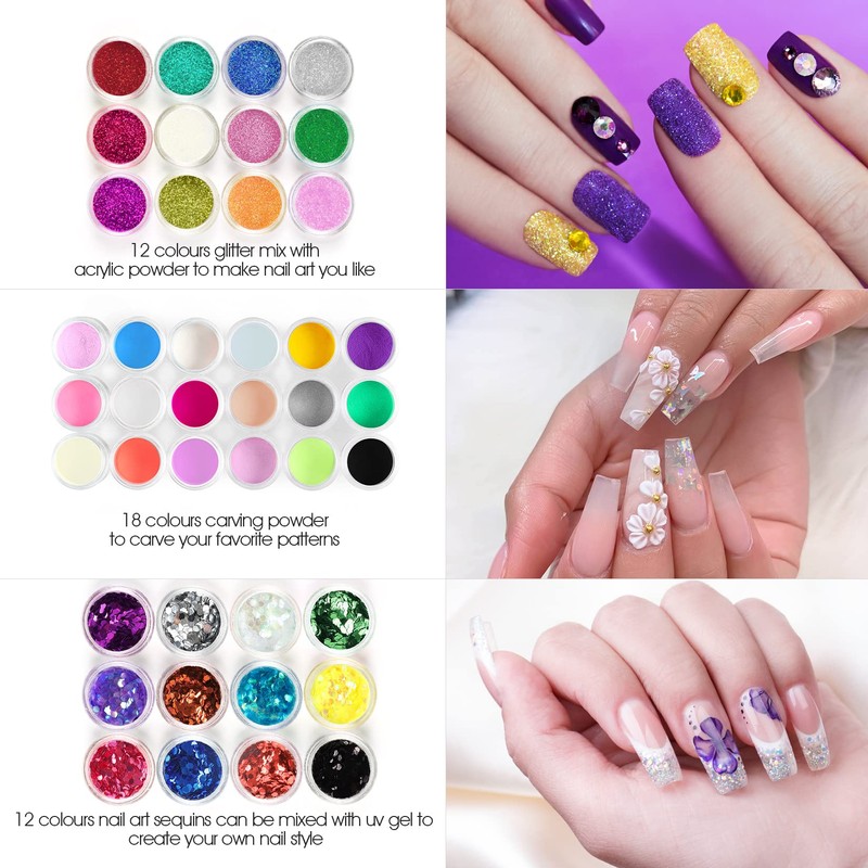 - Acrylic Nail Kits Full Set for Beginners - 42 pcs acrylic powder set professional for you to create your nails, with extra 3 size bottle of white, clear and pink colour. Full set can help you extend your nails quickly and easily. It's suitable to apply in your daily life or some special occasions for acrylic power starter.