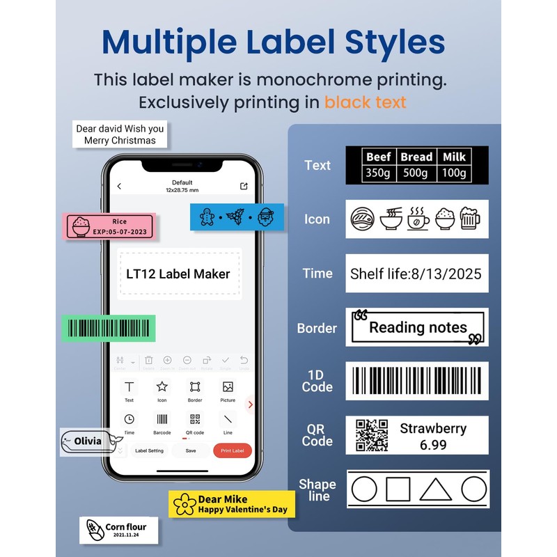 - New Upgrade: The LT12 label maker machine supports 2 editing and printing methods: keyboard editing and Bluetooth connection for mobile editing, meeting your different needs in various scenarios, convenient, fast, and easy to use.(Bluetooth connection supports iOS & Android smartphones and tablets)