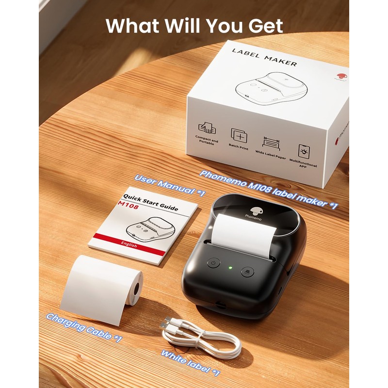 Phomemo M108 Bluetooth Label Printer, Label Maker Machine for Phone and Windows/Mac(USB), Thermal Label Printer for Small Business, Home, Kitchen, Office, Barcode, Address, with 1 Roll 40x30mm Label