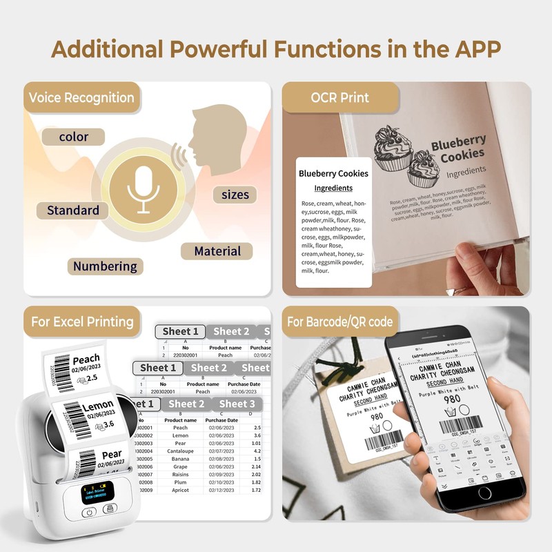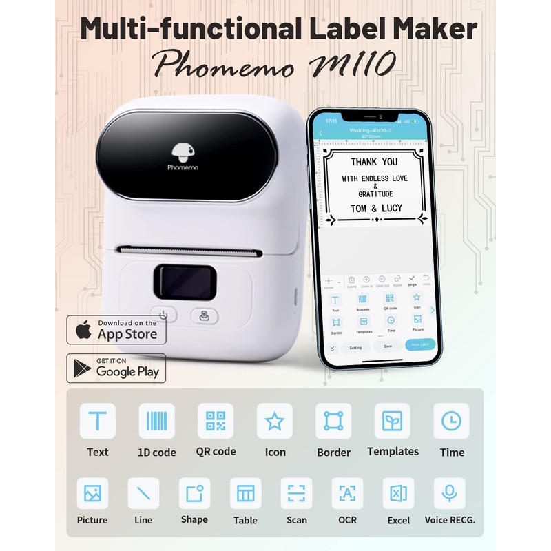 - Phomemo includes label making software and OCR function that can convert the text of the photos into personal text. The design and print make adding labels, logos, text and even QR codes a breeze. Whether you are a beginner or expert, you can customise the labels and achieve excellent printing results.