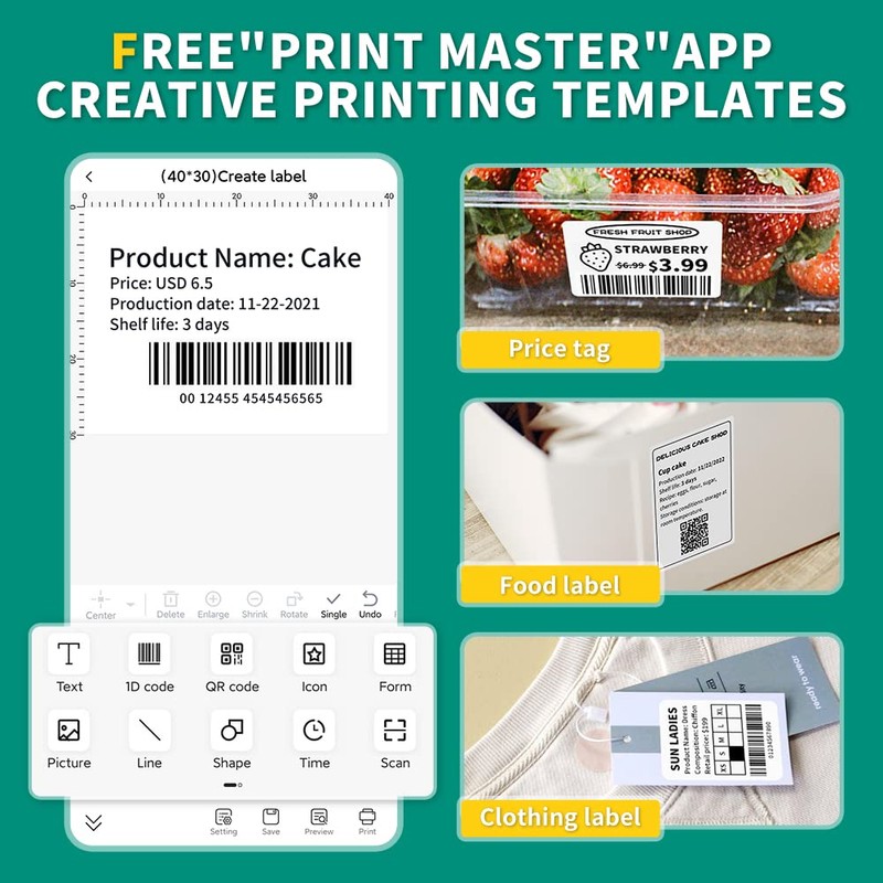 - 【Powerful App】''Print Master'' app is easy to use. you can enjoy pre-designed label templates, It offers variety of fonts, various texts, symbols and icons. Tips for Using App: Install Print Master App from Apple Store & Google Play->Open the Bluetooth->Open the App and Turn on M120 barcode printer->Match and finish connection via the app.Tips:Our bluetooth label printer cannot support computers.