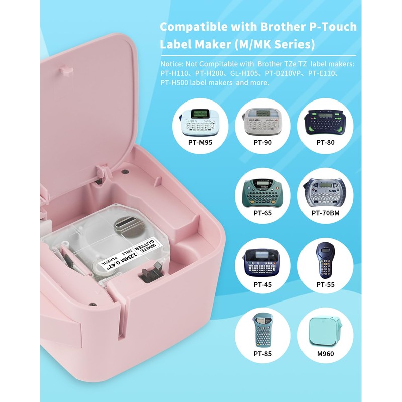 - Compatible Label Maker:Compatible with Brother PT-M95 PT-70BM PT-90 PT-65 PT-80 PT-85 PT-70 PT-45 PT-45M Label Maker that use "M" Tapes.(Notice: Not Compitable with TZe TZ label makers: PT-H110, PT-H200, GL-H105, PT-D210VP, PT-E110, PT-H500 label makers and more)