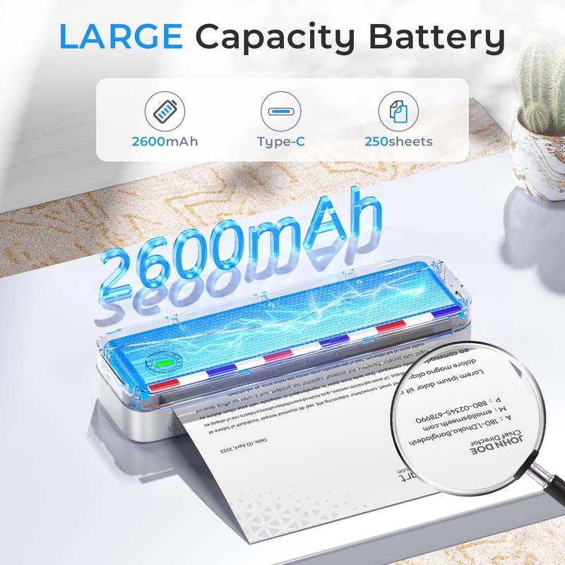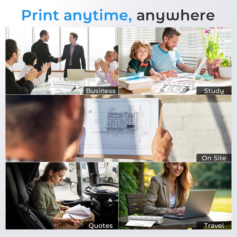 - 300dpi Excellent Printing Quality - The Bluetooth printer for iphone utilizes inkless technology to produce clear and 300dpi high-quality prints, Which make every text and pattern you print crystal clear. M836 mobile printer can print PDF, Word, Images, JPG files, Web,TXT, Such as documents,office documents, receipt, contract, resume, invoice, drawing, school notes