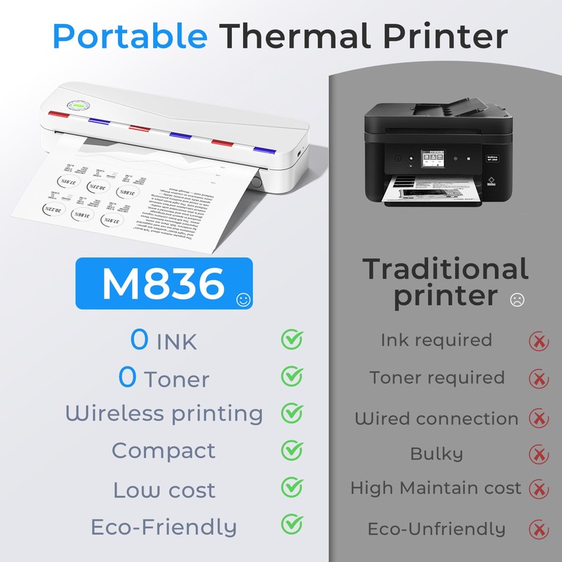 - Inkless Printing - M836 wireless portable printer uses advanced thermal printing technology, Don't require ink, toner, no ink-related blockages, and cleaning issues. NOTE: This Inkless printer is only supports thermal printing paper, not support regular copy paper