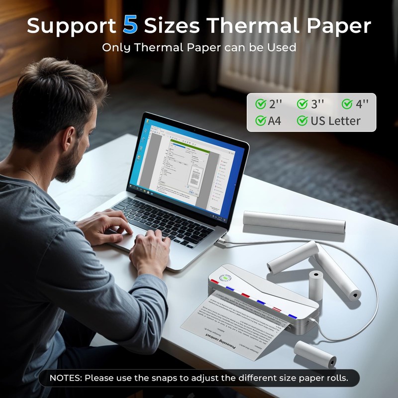 - Phomemo 2025 Upgrade Portable Printer - M836 Thermal printers can support multiple thermal paper sizes - US Letter (8.5" x 11") & A4 (8.27" x 11.69") thermal paper, 2" & 3" & 4" (width 53/80/110 mm). The inkless portable printer can also support 3 paper types, thermal standard paper sheets, roll paper and folded thermal paper