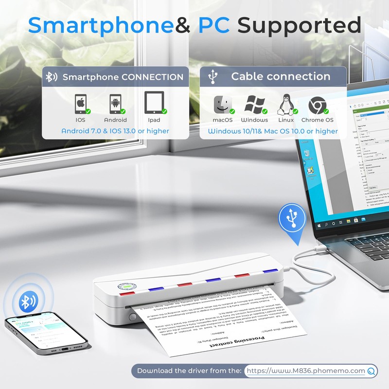 - High Compatibility - M836 inkless portable printer compatible with Phone, iPad and PC. The Small printer supporting iPhone, Android Phone, iPad by Bluetooth connection. And it can also printing by laptop or computer connect with USB cable. ( Need to download the driver first, after installing the printer driver on the computer, the printer needs to be installed with thermal paper and connected to the computer via USB in order to display the printer on the computer.)