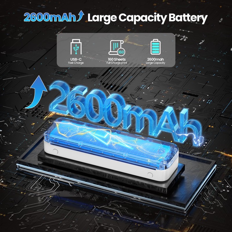 - Extended Battery Life: M834 wireless portable travel printer equipped with a 2600mAh rechargeable battery, the Phomemo M834 printer boasts 116% more capacity than other thermal portable printer, allowing for over 160 pages of continuous printing without power worries.