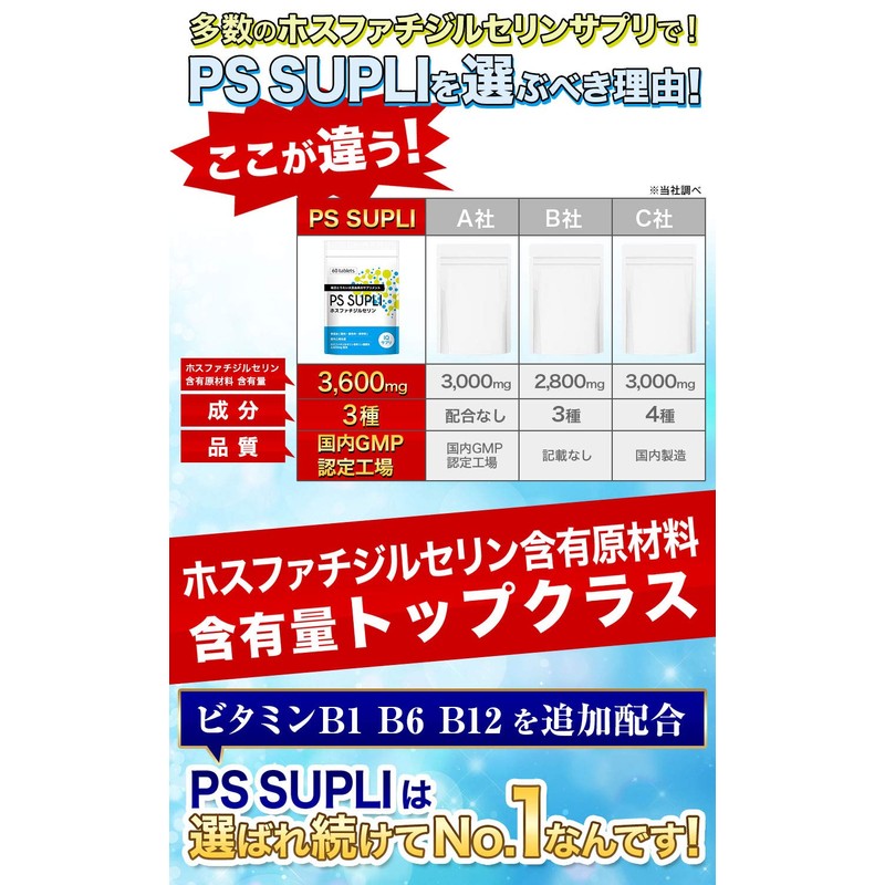 - ✅100%大豆由来の遺伝子組換えなしのホスファチジルセリン含有原材料を使用し更にビタミンB1、B6、B12を配合しました。