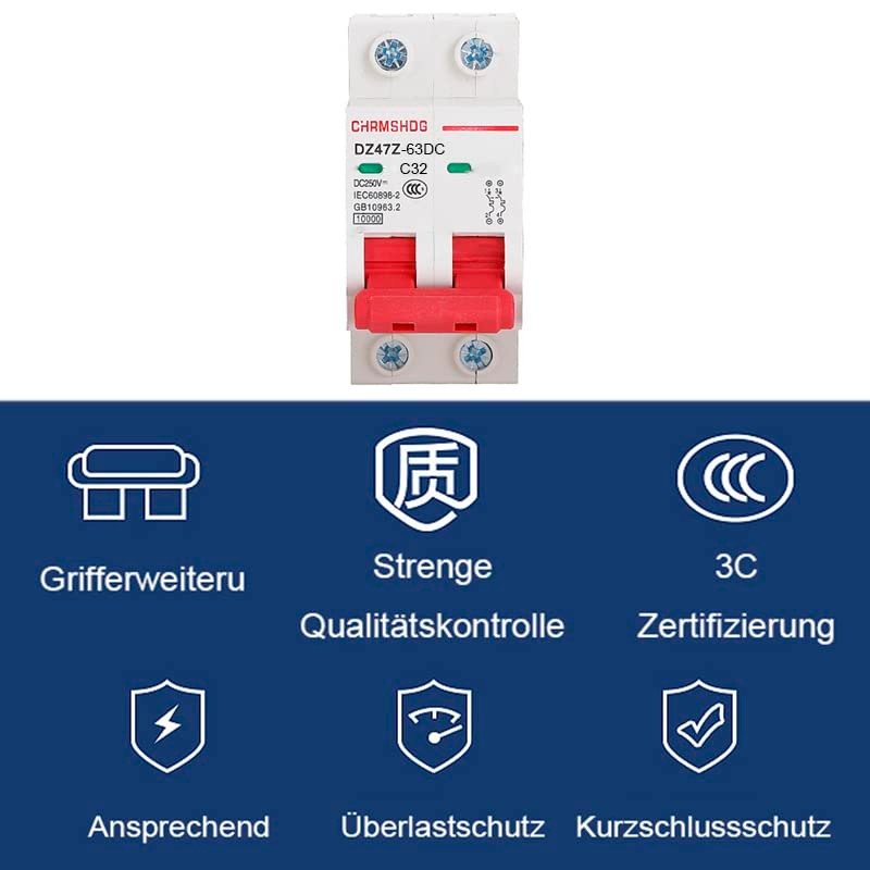 Photovoltaic Circuit Breaker 2P DZ47‑63DC 1000V 32A PV System Insulator Protection Air Switch Circuit Protection for Solar Energy, Small Power Generation System (1000V 32A)