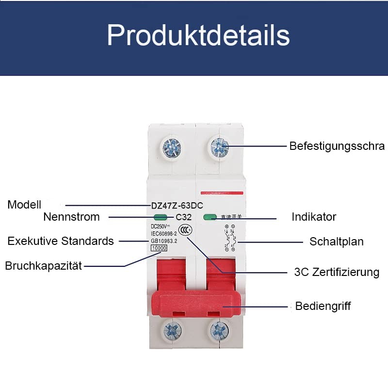 - Specification and model: DZ47-63DC, material: PA66, rated current: 32A, rated voltage: DC 500V, rated termination breaking capacity (home icn): 6000A.