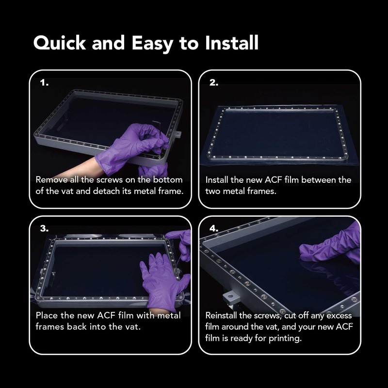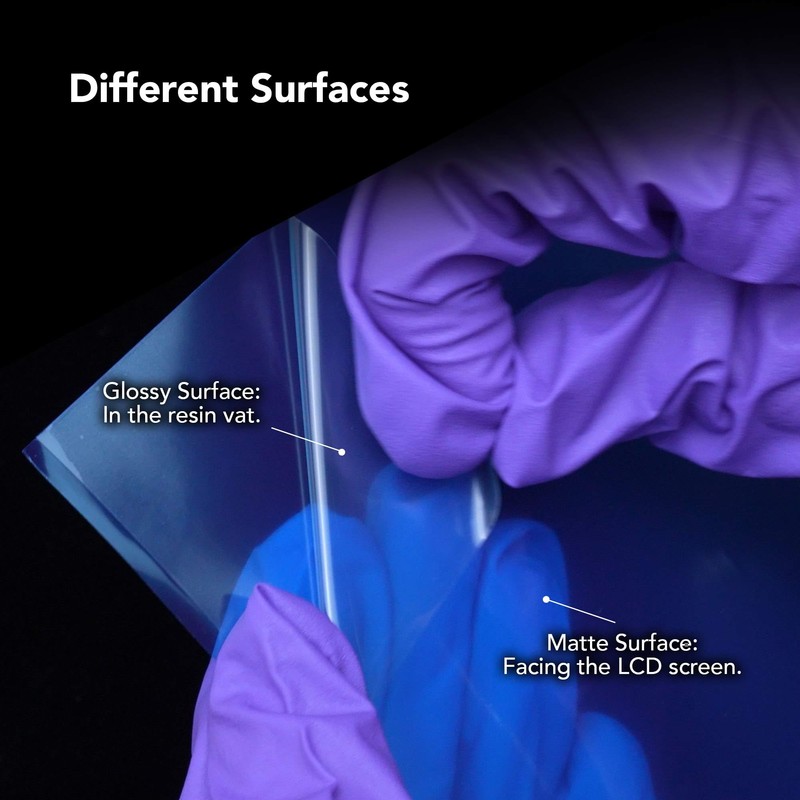 - 【Dual Surfaces】The ACF film has two different surfaces. When installing ACF film to the resin vat, make sure that the glossy surface is in the resin vat while the matte surface is facing the LCD screen.