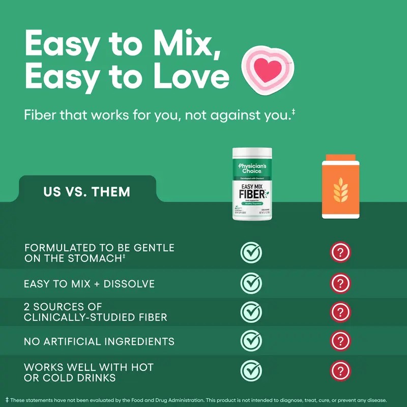 Physician’s Choice Easy Mix Fiber is a prebiotic fiber powder that makes it simple to add more fiber to your daily routine. This sugar free and unflavored formula blends easily into hot or cold drinks to support digestion, regularity, balanced hunger, and overall gut health. - 6g of prebiotic fiber from two clinically studied sources to support digestion, regularity, feeling of fullness, and gut health - Easy to mix into your favorite hot or cold drinks without any clumping or grit. Just stir, sip, and forget it’s there - Sugar-free, unflavored powder made without any artificial ingredients Product Use: Mix 1 heaping tablespoon (6.7g) into your favorite hot or cold drink or snack. Shake, stir, or blend for 60 seconds. Use daily to support digestive health.
