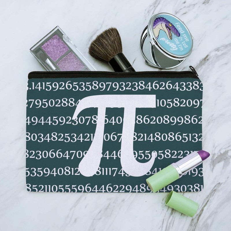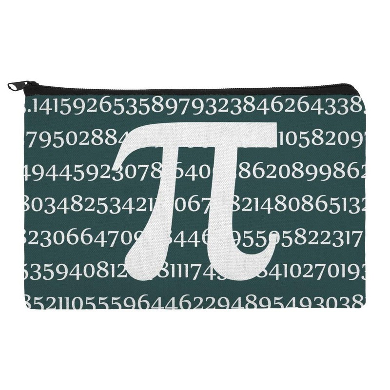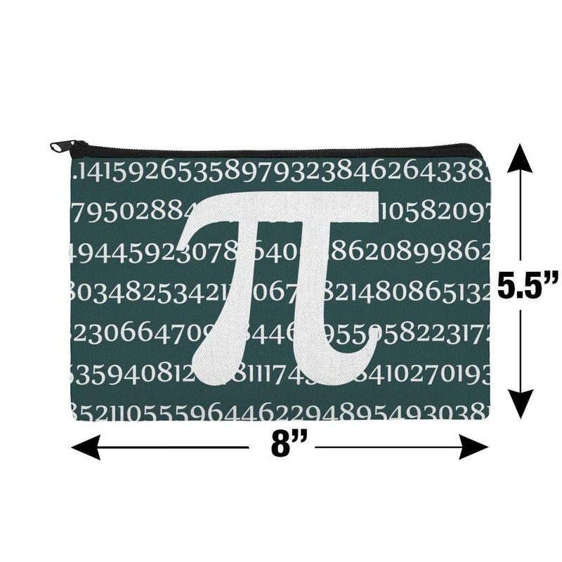 **About The Product:** Kiss and makeup with the zipper canvas cosmetic bag from Graphics and More! This makeup bag is the perfect travel companion, either on a day out for errands, or for a trip across the country. Features the image as shown on one side of the bag, with the other side left natural. We hope this bag will be the highlight of your collection! Measures approximately 8.0" (20cm) x 5.5" (14cm). **About The Design:** A little pi for the math fan in your life!