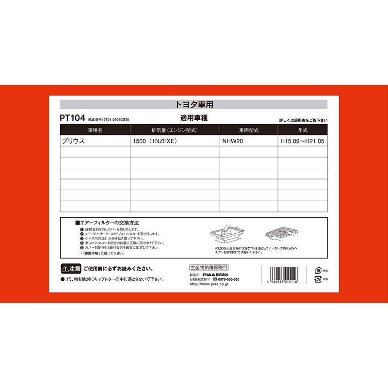 PIAA エアーフィルター (エアフィルター) 1個入 [トヨタ車用] プリウス_他 PT104