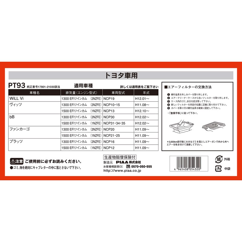 PIAA エアーフィルター (エアフィルター) 1個入 [トヨタ車用] ヴィッツ・bB・ファンカーゴ_他 PT93