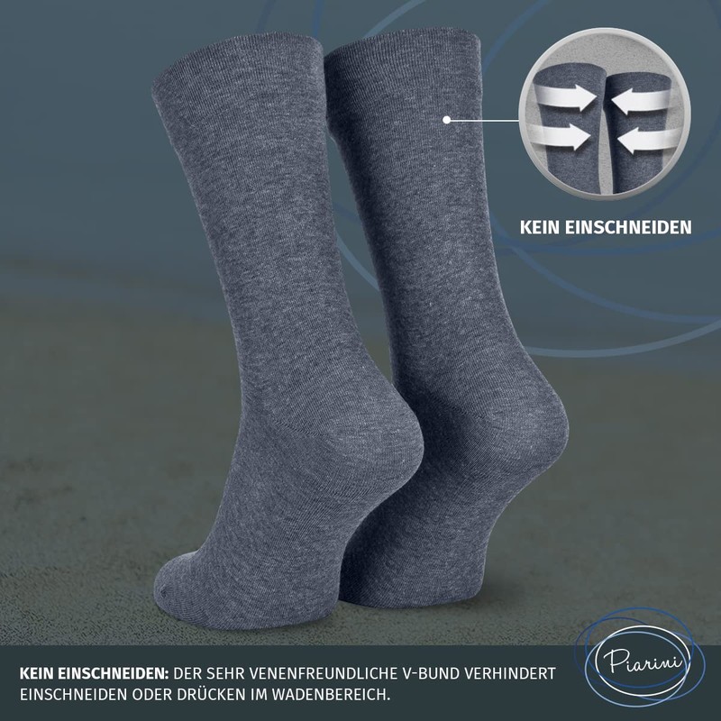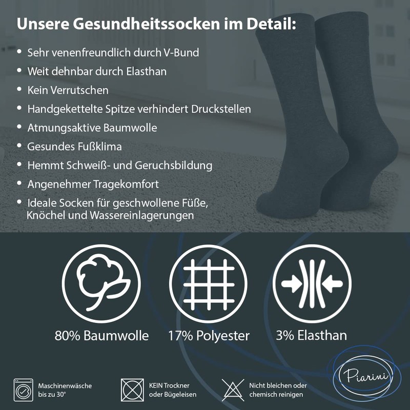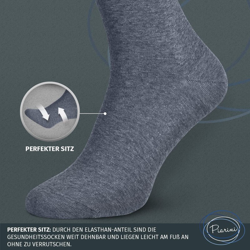 Die Komfort Socken sind durch das Elasthan weit dehnbar und liegen angenehm leicht am Fuß an ohne zu verrutschen .