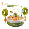 - Versatile board game set: the versatile board game set includes a turntable with music on which mini dinosaurs fly. The turntable is powered by three AA batteries, which are not included. Children can catch the dinosaurs with nets, fish with a magnetic rod, play bowling with the rolling car and dinosaurs or flip the board for a game of tic tac-toe.
