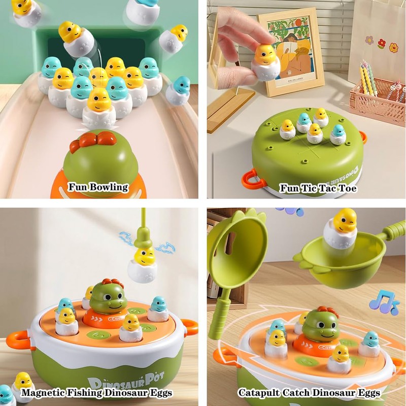 - 【4 in 1 Dinosaur Toy】This board game includes 2 magnetic fishing, 2 fishing nets, 1 rotating board, 1 dinosaur car and 10 mini dinosaur egg cups. It offers 4 game modes: catching, magnetic fishing, tic tac-toe and bowling. It is a fun family game for 2 players and an interactive toy for children.