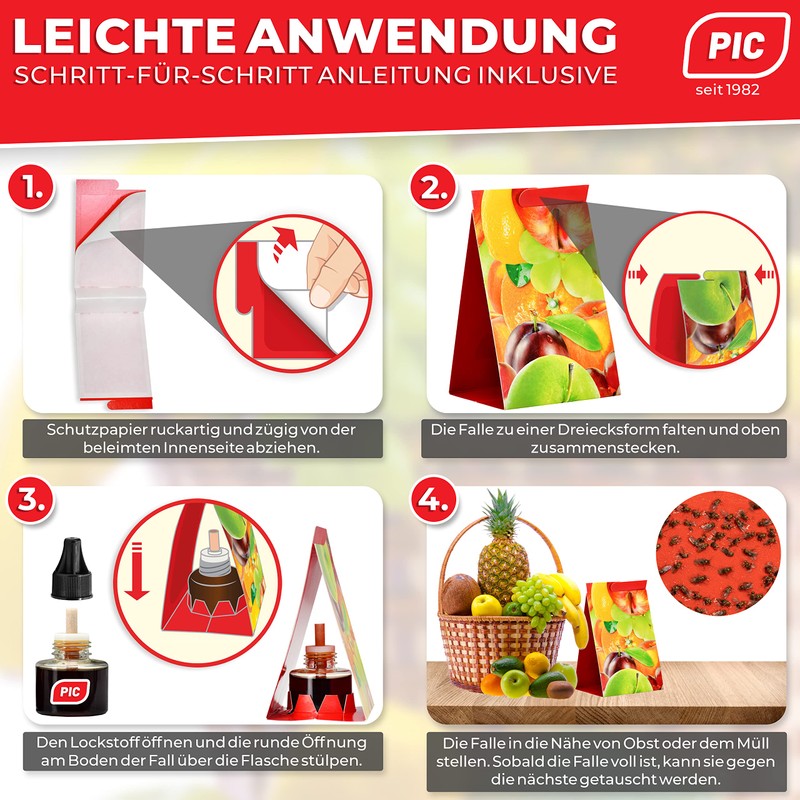 - Easy to use: illustrated instructions on the packaging (English language not guaranteed). Contents of delivery: 4 glue traps with 2 attractant containers.