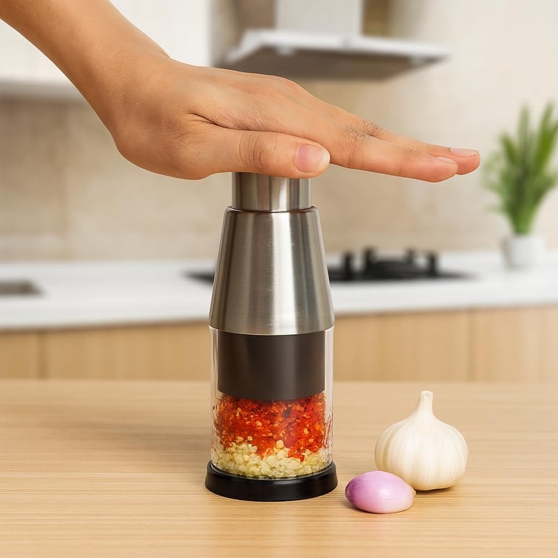 - El picador de ajo manual puede manejar una variedad de ingredientes como pimientos, cebollas y trozos de verduras para un uso más versátil en la cocina.