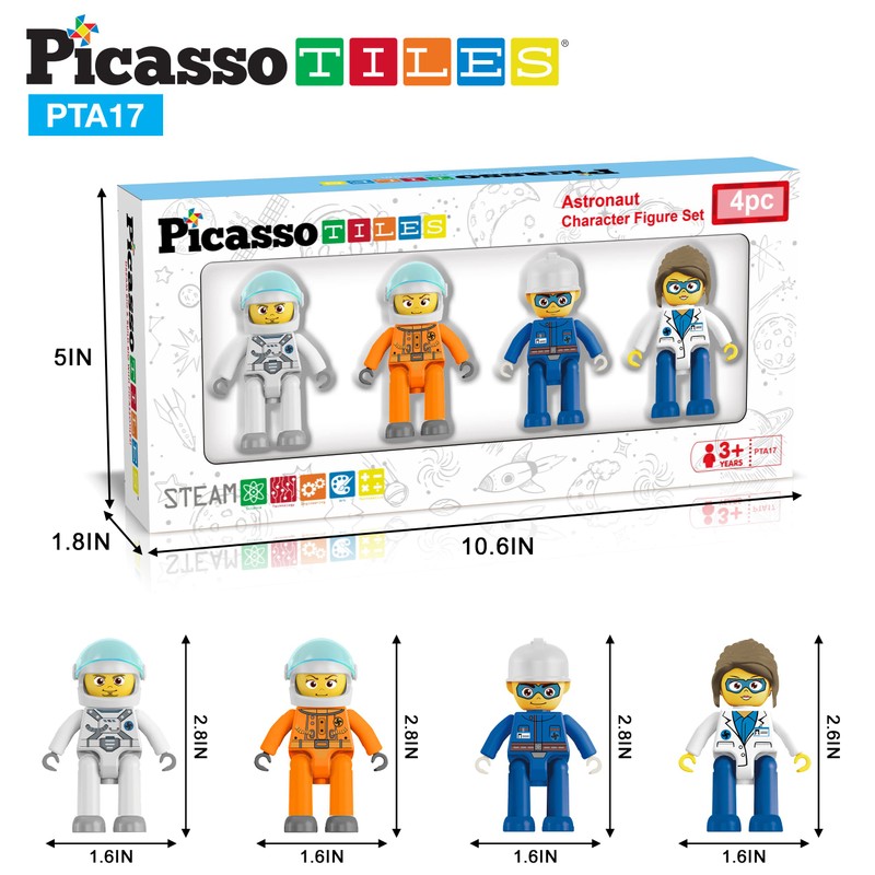 Picasso Toys Magnetic Character Action Figures 4-Piece Astronaut for Building Block Tile Toddler Toy Set Magnetic Expansion Pack Age 3 and Up Educational STEM Learning Pretend Playset Construction