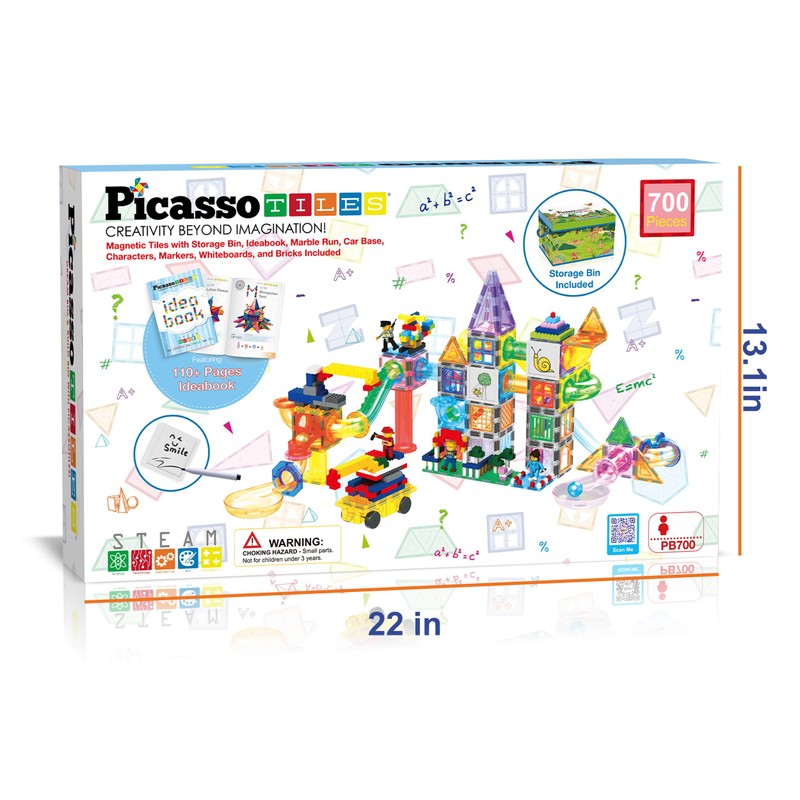 - DREAM BIG & BUILD BIG: Elevate imagination and creativity with PicassoTiles 700 piece Magnetic Tiles Construction Building Block Playset, featuring a marble run, interlocking brick blocks, magnet tile elements, whiteboard pieces with markers, a car base, a toy storage bin, an Ideabook, and playful characters, offering hours of inventive and interactive fun while enhancing educational STEM learning and sensory development. Ideal for boys and girls ages 3 and up.