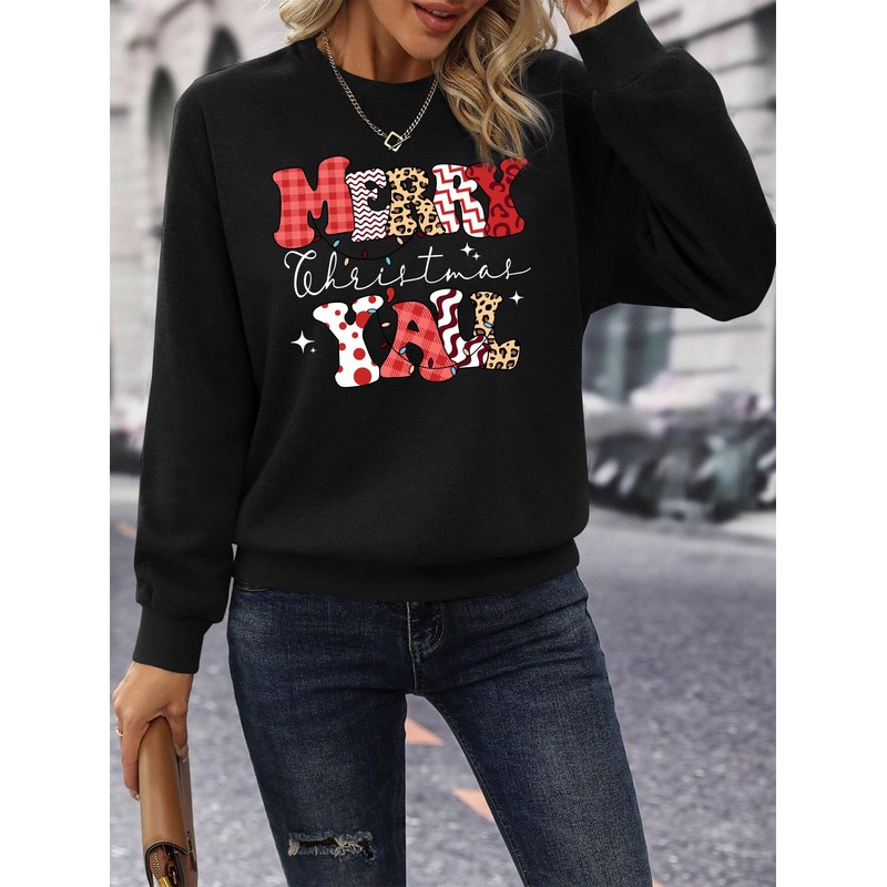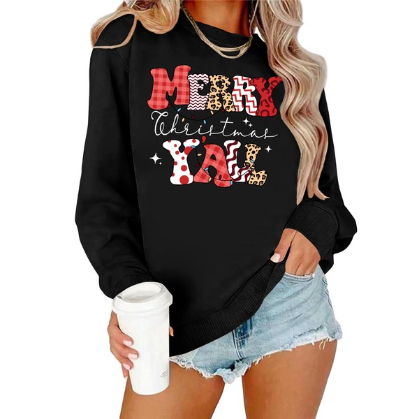 Christmas sweatshirts for women; funny merry christmas y’ all letter print sweatshirt; friends christmas sweatshirt; family christmas sweatshirts; cute christmas sweatshirt; merry christmas sweater; xmas graphic sweatshirts for women; holiday sweaters for women