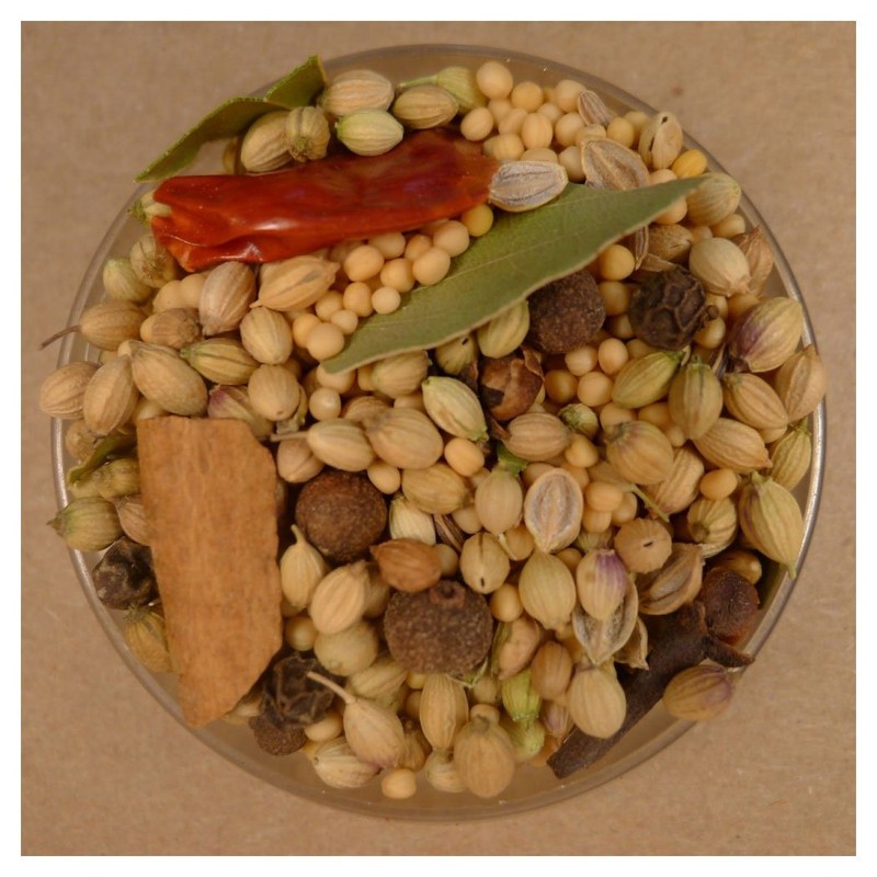 Pickling Spice is a blend of herbs and spices used for seasoning in various foods. It is most frequently used in concert with vinegar to pickle cucumbers.ÊSuggested Use: Used to pickle cucumbers this blend also adds complex flavor to braised meats, stews, beans and rice dishes. Ingredients: Coriander Seeds, Mustard Seeds, Bay Leaves, Cloves, Black Peppercorns, Allspice, Dill Seeds, Saigon Cinnamon Whole and Chili Pepper Whole.Ê Basic Prep: Ready to use, add to recipe as needed. It is helpful to tie pickling spices in a coffee filter, tea bag or cheesecloth for easy removal after cooking.