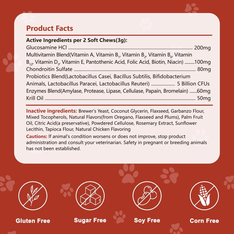 - Hip Support:Chewable tablets for dogs all contain chondroitin, glucosamine, and a multivitamin complex, these help reduce joint inflammation caused by normal activity, support hip and joint health, and improve joint flexibility in dogs and cats!