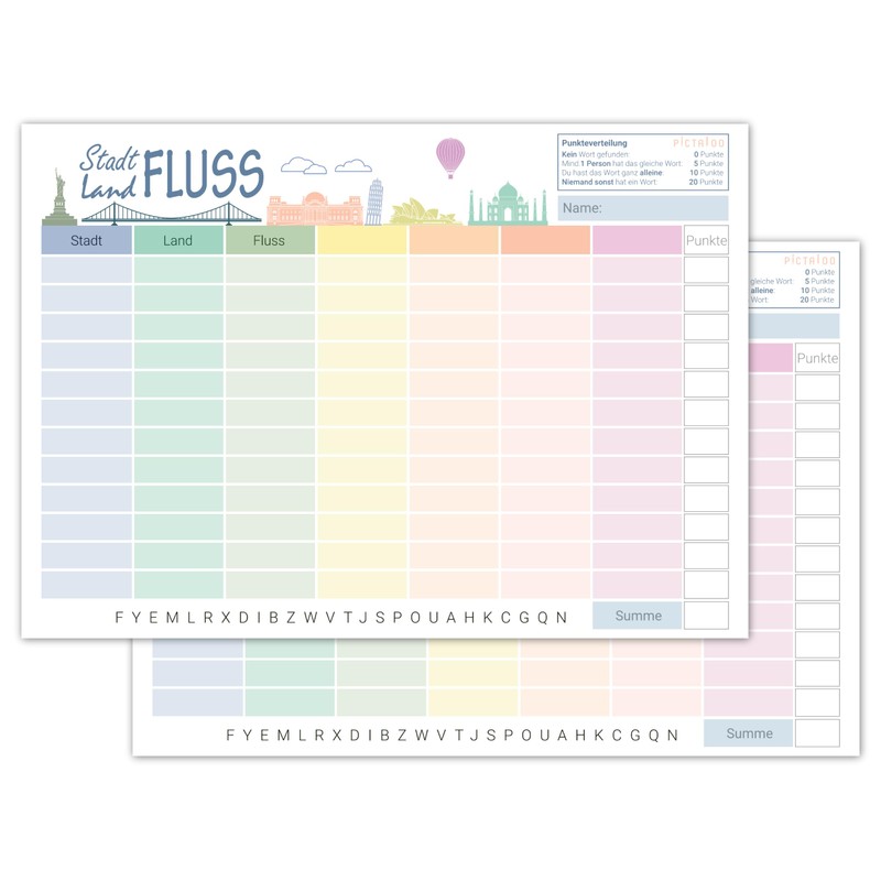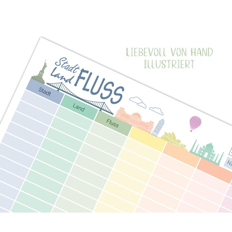 - Versatile: the block only specifies the standard categories city country river. The other four fields can be freely selected per game. Whether colour, food, toys, animal or car brand - the possibilities are almost limitless and can be adjusted according to your mood.