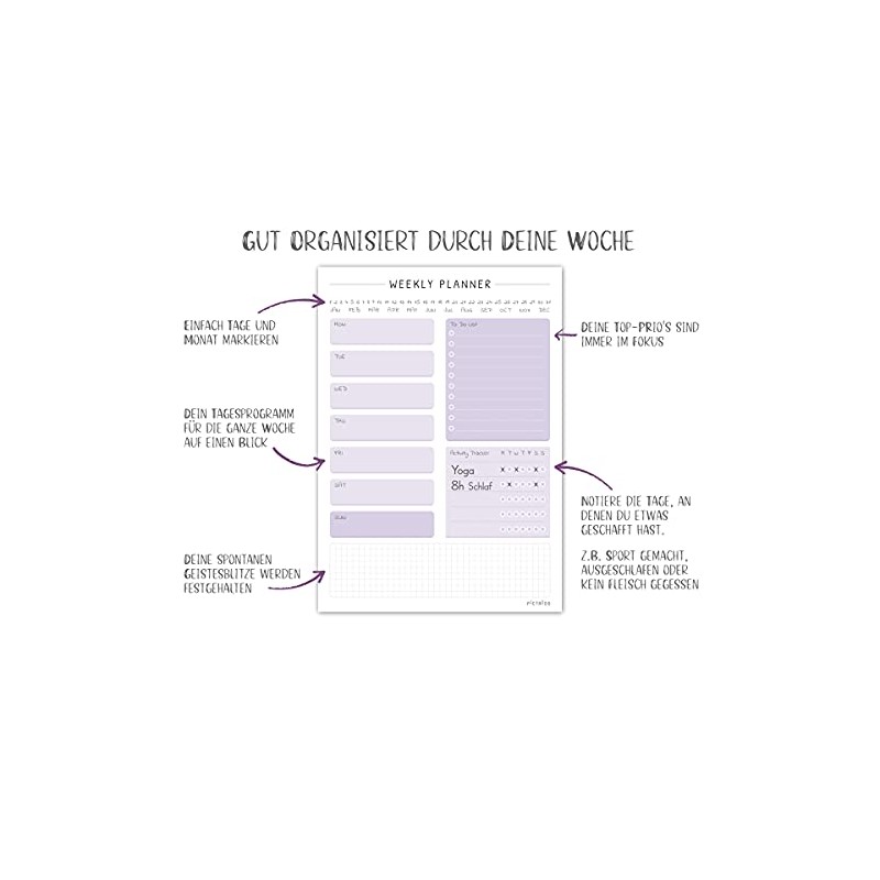 - Thoughtful elements: In addition to a weekly overview for all appointments and tasks, the planner supports you with a universal activity tracker with which you e.g. days when you have exercised, slept or cooked.