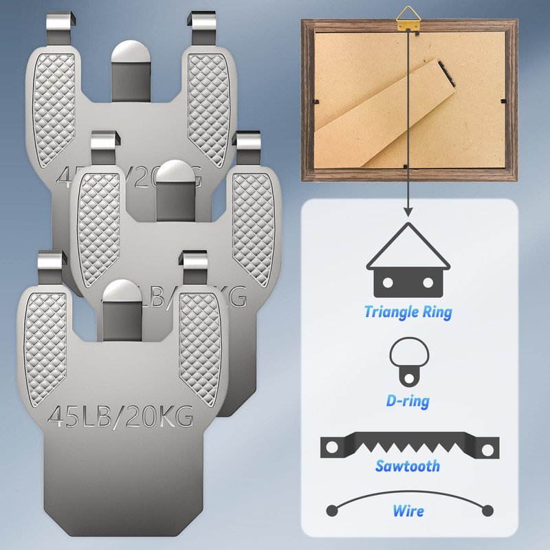 - Heavy-Duty Picture Hanging Hooks – Engineered with reinforced hardened steel claws, this picture hanging kit includes hooks that securely hold up to 45 pounds (20kg), surpassing standard options. Perfect for heavy-duty picture hangers, they safely support mirrors, large frames, artworks, and decor without bending or falling.