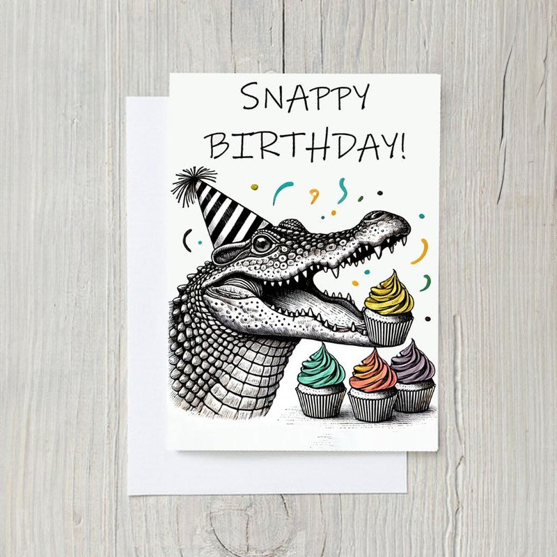 - Adorable alligator birthday card: This Snappy birthday card is perfect for any animal lover. Featuring a whimsical alligator illustration holding cupcakes and wearing a party hat, this 5x7" card includes a framed envelope for a delightful presentation. Its humorous pun "Snappy Birthday" makes it ideal for kids and adults alike, bringing a smile to everyone's face.