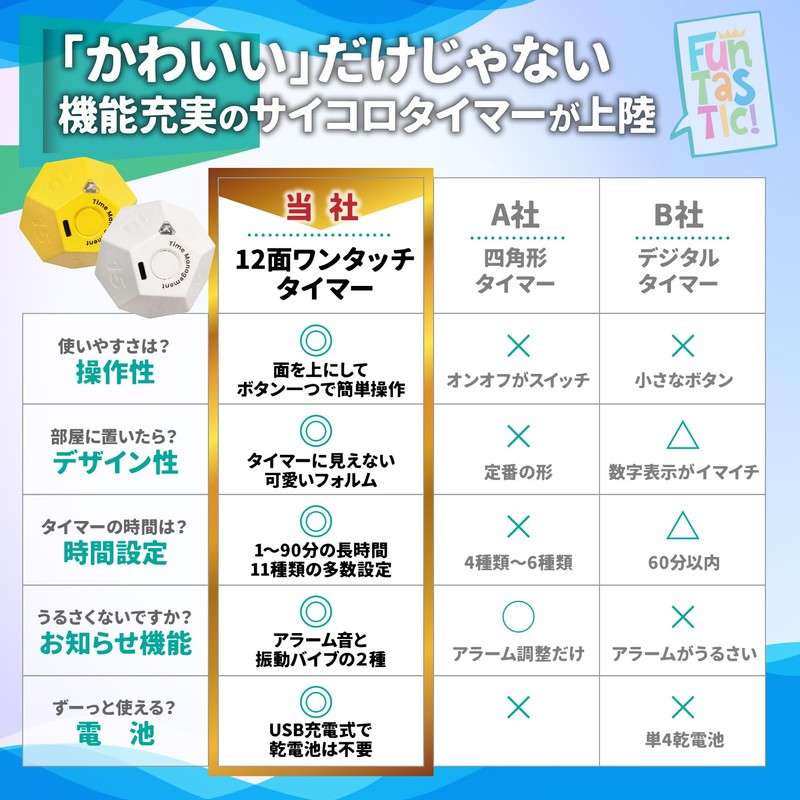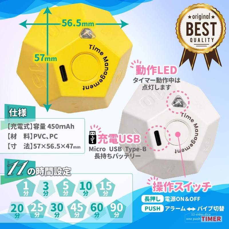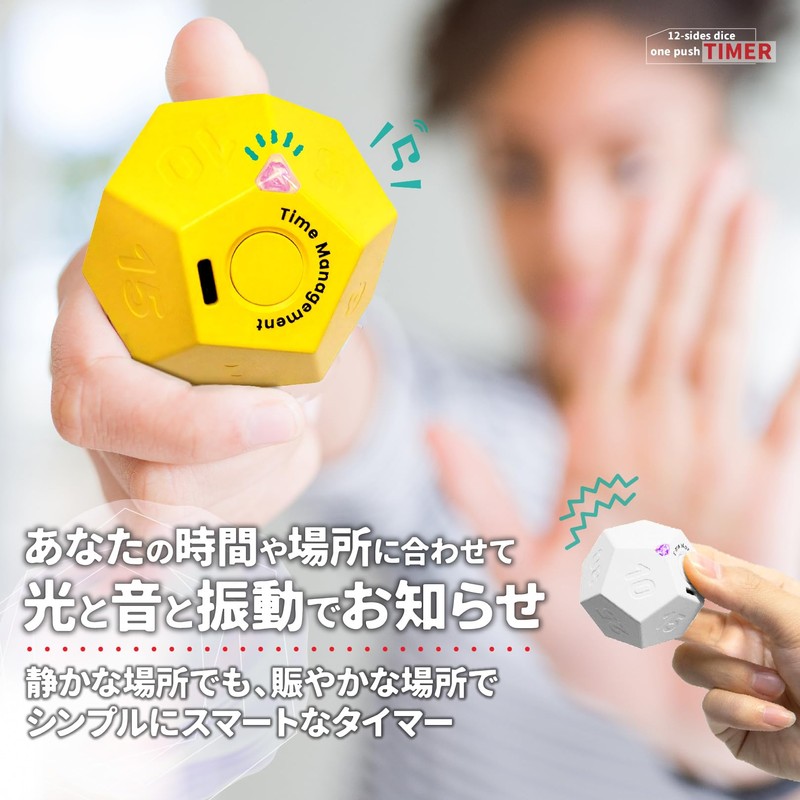 - The 12-sided timer eliminates the hassle of constantly hitting the buttons to set the time. Simply turn the time you want to set up, and start countdown. 11 different time settings from 1 to 90 minutes. Choose from an alarm, vibrator, and a cute compact size that makes it easy to carry around