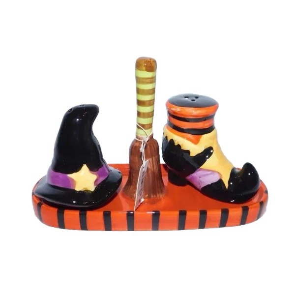 Pier 1 Witch Salt & Pepper Shaker Set Witch's Hat Boots with Stand / Holder Pier 1 New