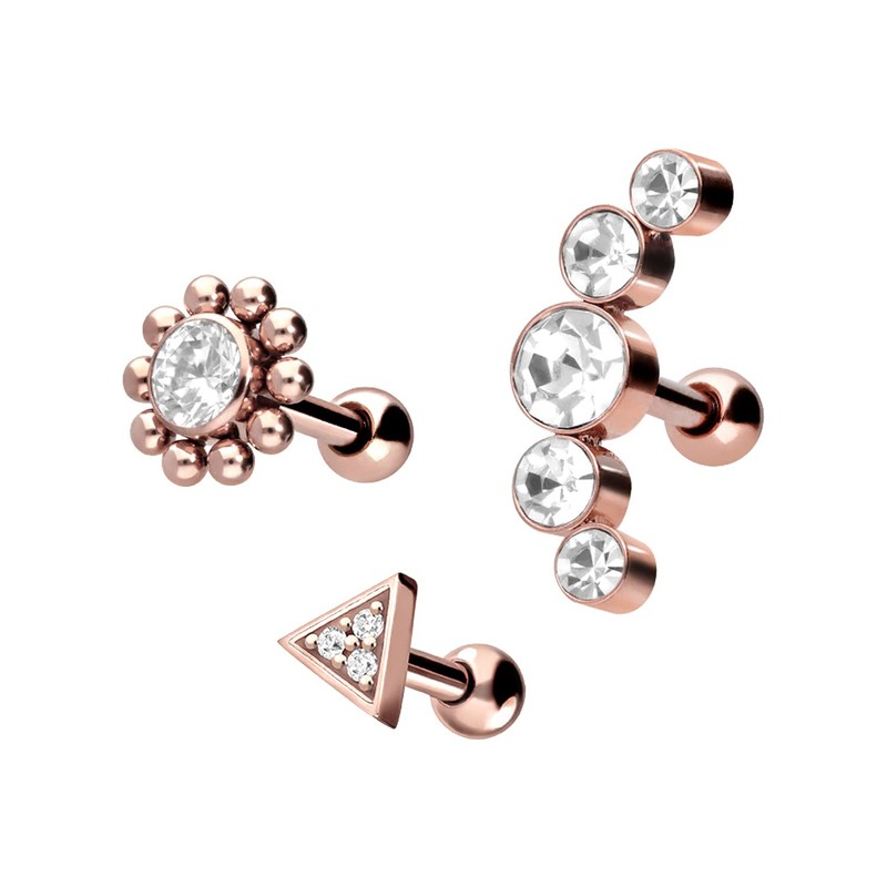 - Box contents: 1 ear piercing set with 3 different designs, rose gold, bar thickness: 1.2 mm, bar length: 6 mm