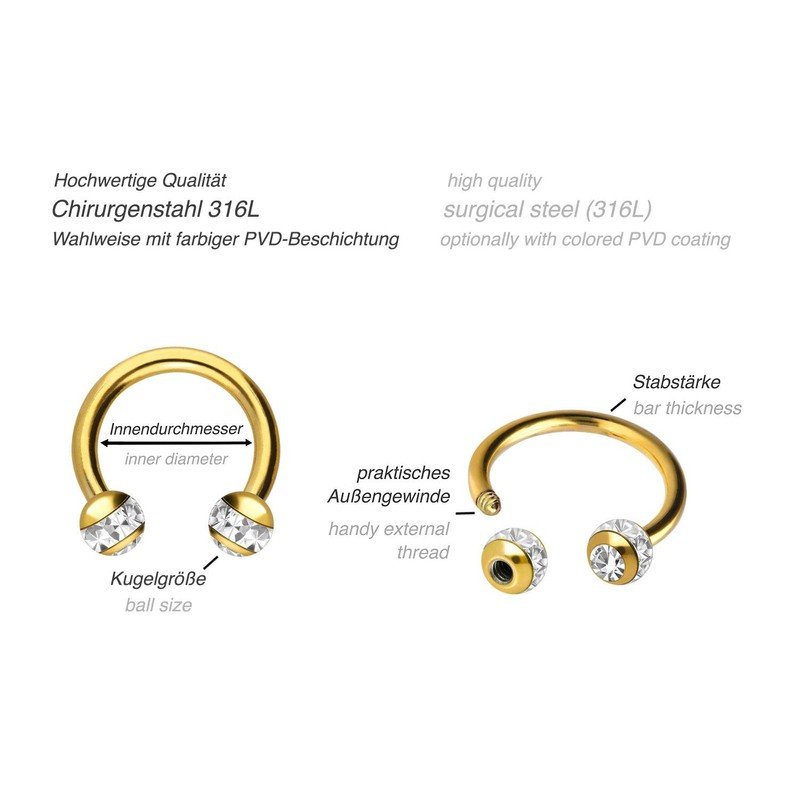 Surgical Steel 316L - Horseshoe Ring Epoxy Ring Balls + Crystals This beautiful horseshoe ring is made of high quality surgical steel 316L, which is known to have material properties such as high durability and flat texture. If desired, a scratch-resistant PVD coating provides a bold colour of choice, further enhanced by the high-gloss polish. There is a screwed-on surgical steel ball at each end of the open ring. These two balls are each decorated with a ring of sparkling crystals that are optimally protected with the help of a clear epoxy resin layer. In addition, the balls are equipped with another large crystal. The jewellery is available with a rod thickness of either 1.2 or 1.6 mm in the inner diameters listed below. Material: Surgical steel 316L epoxy resin. Surface: mirror polished, PVD coating. Material, colour: gold, rose gold, black, silver. Crystal colour: crystal clear. Rod thickness: 1.2 / 1.6 mm inner diameter (with 1.2 mm rod thickness): 5 / 6 / 7 / 8 / 9 / 10 / 12 mm inner diameter (with 1.6 mm rod thickness): 7 / 8 / 9 / 10 / 12 / 14 / 16 mm ball size (with 1.2 mm rod thickness): 3 and 3 mm ball size (with 1.2 mm rod thickness, from 7 mm inner diameter, as well as 1.6 mm rod thickness): 4 and 4 mm ball size (for 1.6 mm rod thickness, from 10 mm inner diameter): 5 and 5 mm.