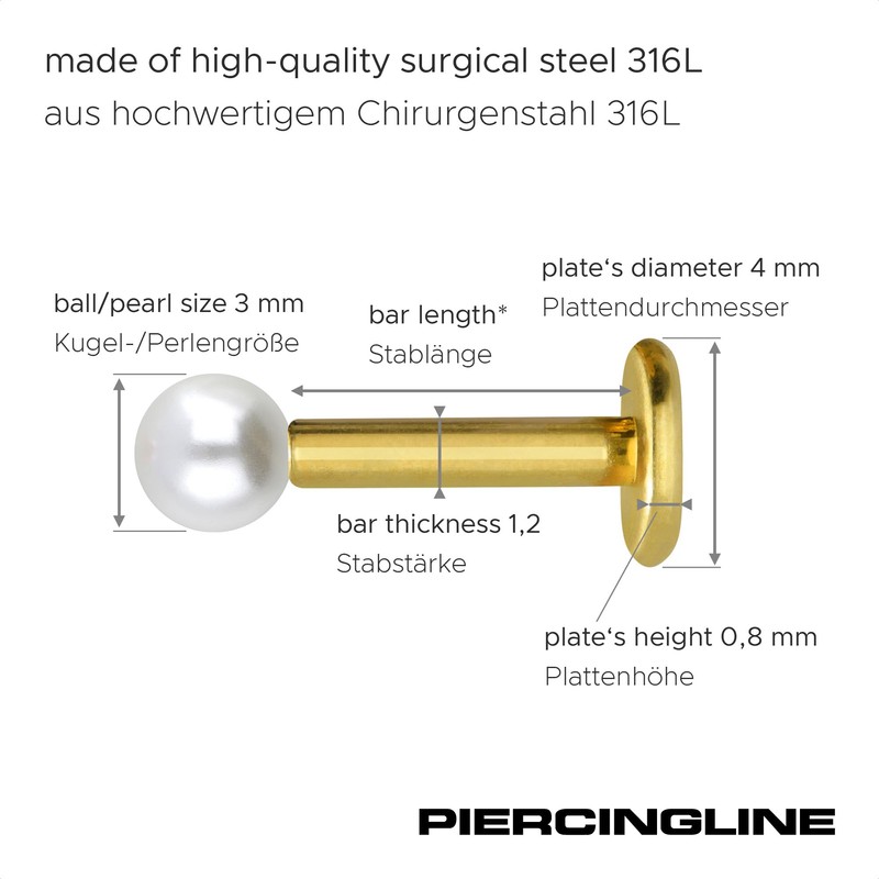 - Box contents: 1 surgical steel labret stud, 1.2 mm bar thickness, 10 mm bar length, gold colour, 3 mm bead size