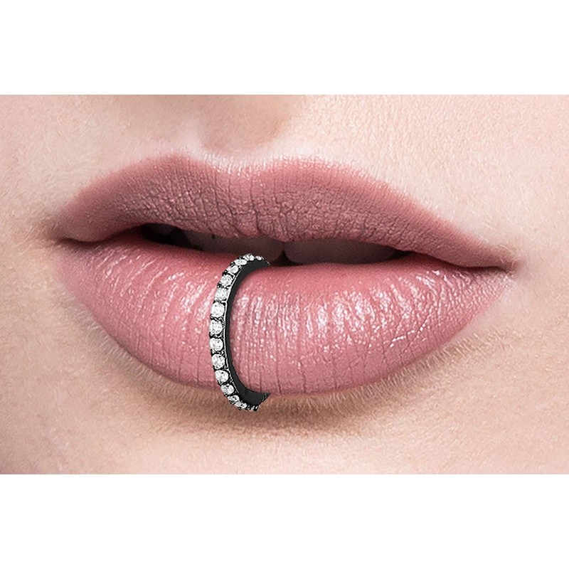 Surgical steel 316L segment ring clicker | Surgical steel 316L - segment ring clicker encased crystals | The segment is attached to a hinge thanks to which the ring can be easily opened and inserted into the stitch channel. Made of high-quality 316L surgical steel, which is optionally equipped with a coloured PVD coating, it provides a very good quality and intense colour. The stylish design with encased crystals adds sparkle and makes it a great eye-catcher. This piercing has a post thickness of 1.2 mm and is available in the inner diameters listed below. The clicker piercings are suitable for use in the septum and many other body regions (such as the ear). Surgical steel 316L. Surface: highly polished / PVD coating. Material colour: gold / rose gold / black / silver. Crystal colour: crystal clear / rainbow / black. Post thickness: 1.2 mm. Inner diameter: 5 / 6 / 7 / 8 / 9 / 10 / 11 / 12 / 14 mm. All dimensions are approximate.