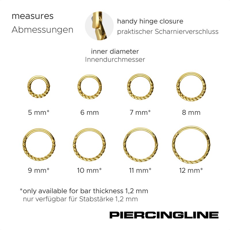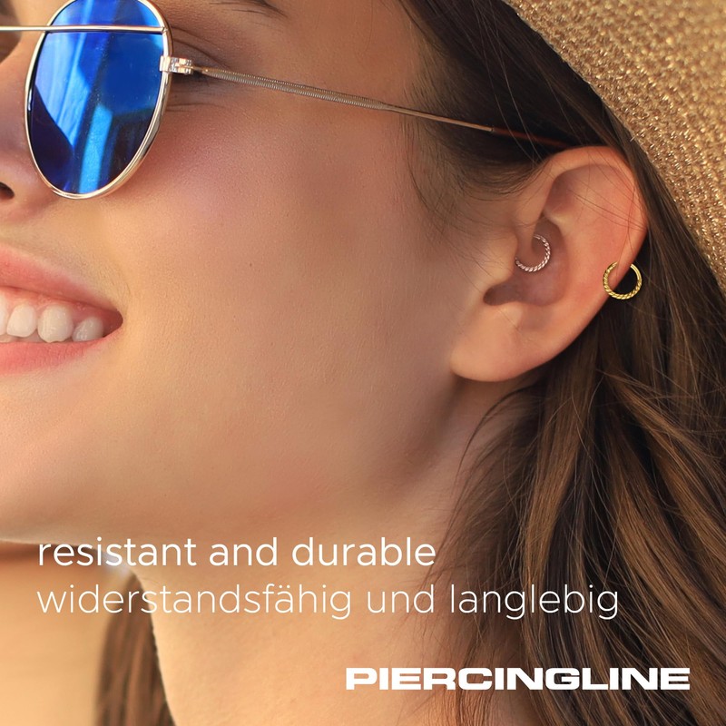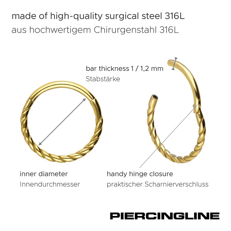 This detailed clicker is an absolute eye-catcher. Made of high-quality 316L surgical steel, with an optional beautiful PVD coating, it offers very good quality and texture. The twisted design looks very elegant and radiates its very special charm. Clicker piercings are suitable for use in the septum and many other parts of the body, such as the ear.