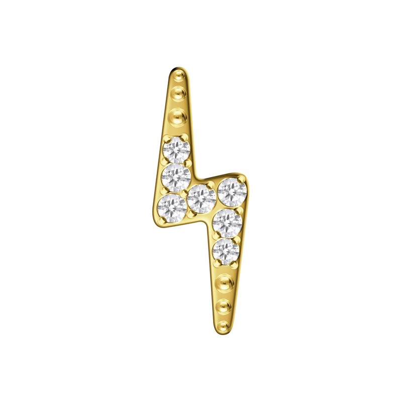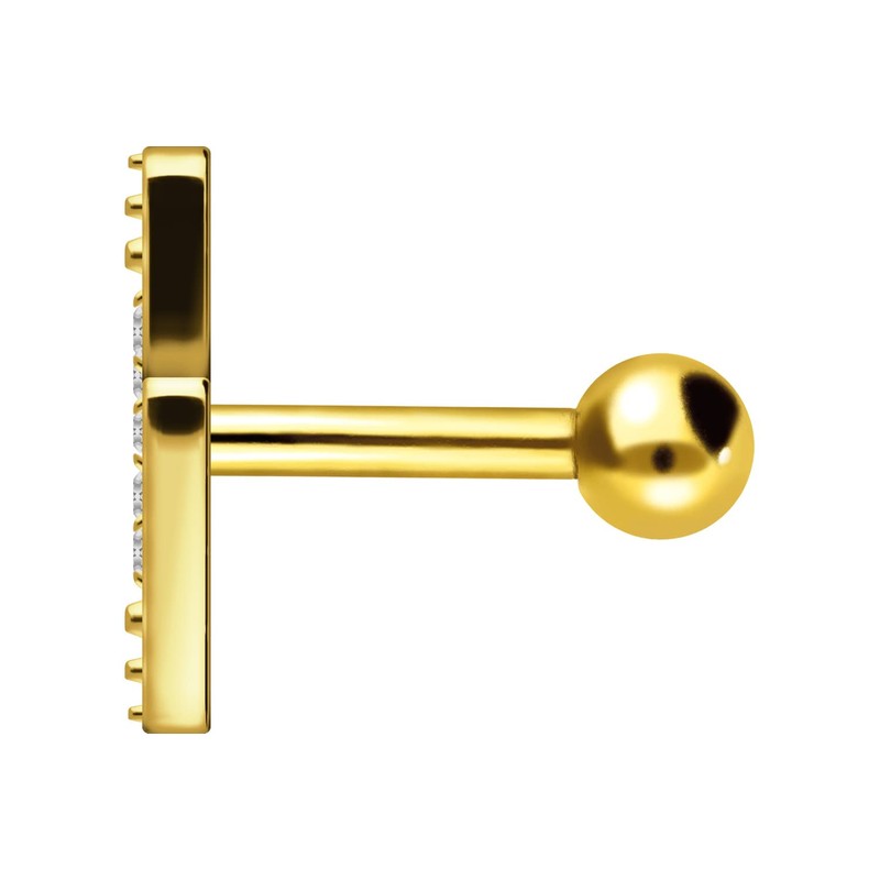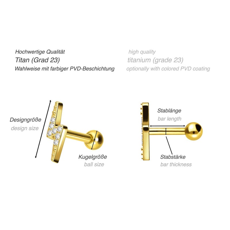 - Box contents: 1 titanium ear piercing, gold colour, 1.2 mm bar thickness, 6 mm bar length, 3 mm ball size, crystal colour crystal clear, design size (flash + set crystals): 3.5 x 10 mm
