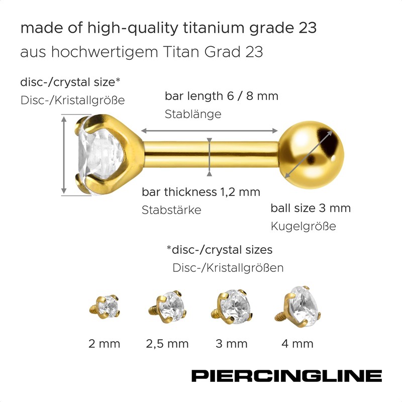 - Box contents: 1 titanium ear piercing, gold colour, 2 mm crystal size, bar thickness: 1.2 mm, bar length: 8 mm, thread: 0.9 mm