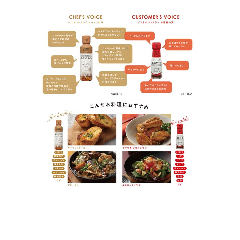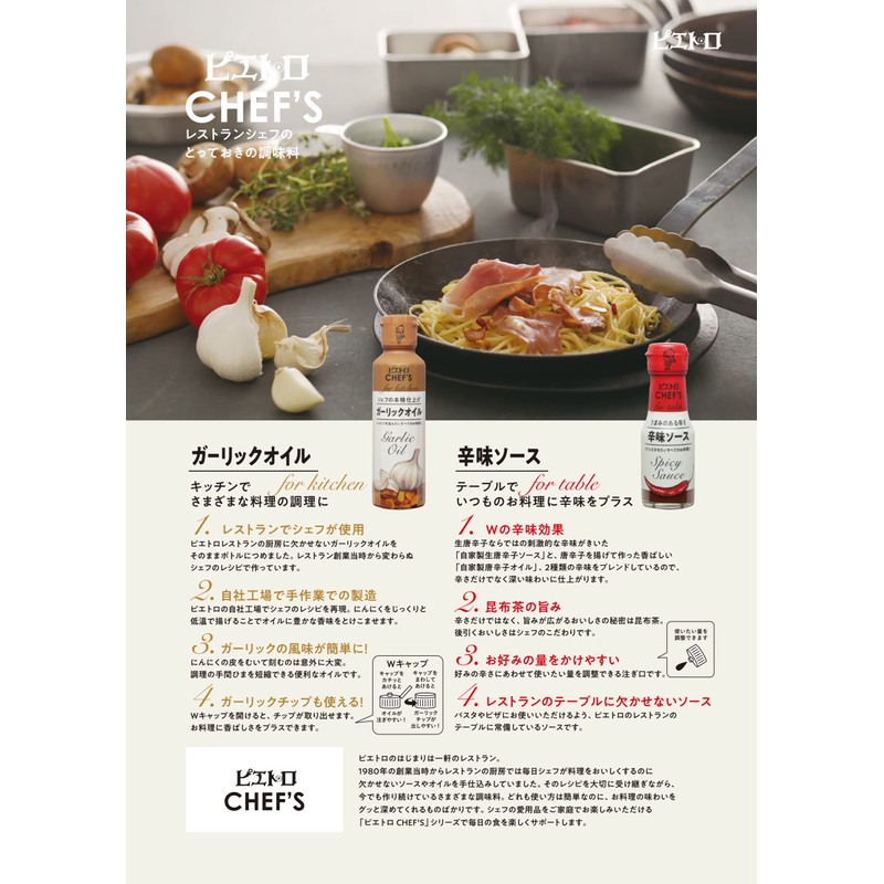 Versatile. Convenient and delicious. This seasoning allows you to enjoy your favorite Pietro chef's products at home. The deliciousness of the product is still delicious. Pietro's signature garlic oil with low temperature fried garlic chips Garlic chips are added inside the bottle so you can enjoy the scent of garlic all the way through. The oil also has the scent of chili peppers and spicy flavor. The boasting garlic oil is actually used in pietro restaurant kitchens and is an easy way to elevate the flavor of your restaurant.